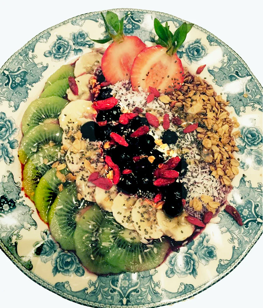ORGANIC UNSWEETENED ACAI BOWL WITH KIWI , BANANA, GOJI BERRIES COCONUT FLAKES AND CHIA SEEDS